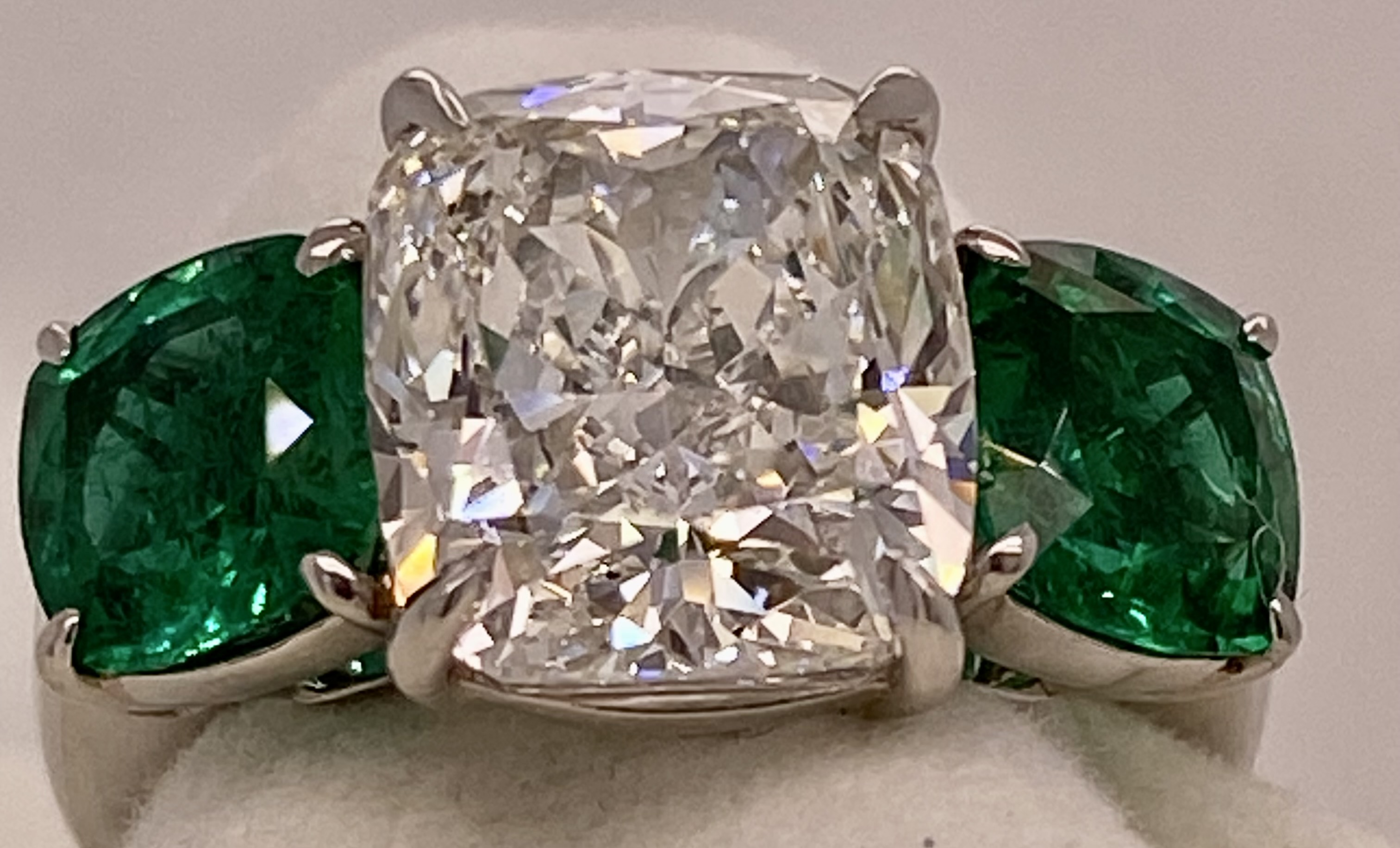 Exquisite Platinum Cushion Diamond and Emerald three stone ring