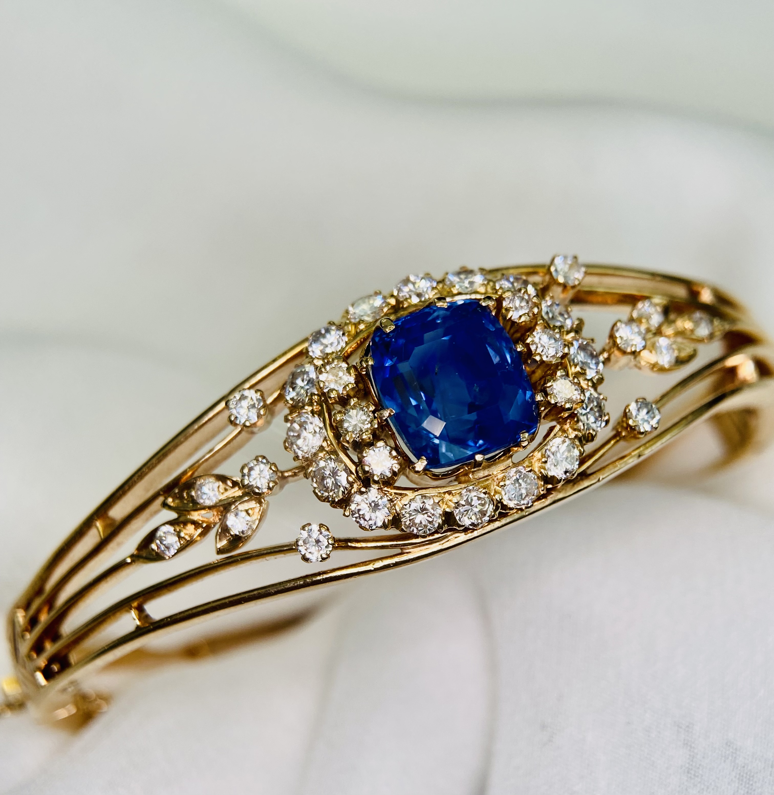 The sapphire is embraced by halos of scintillating diamonds, their brilliance enhancing the central stone’s pristine beauty and echoing the light filtering through a garden’s foliage. This bangle combines the artful intricacies of its era with a whisper of nature, featuring filigree patterns and openwork that reveal a heart captivated by the organic forms of the natural world.