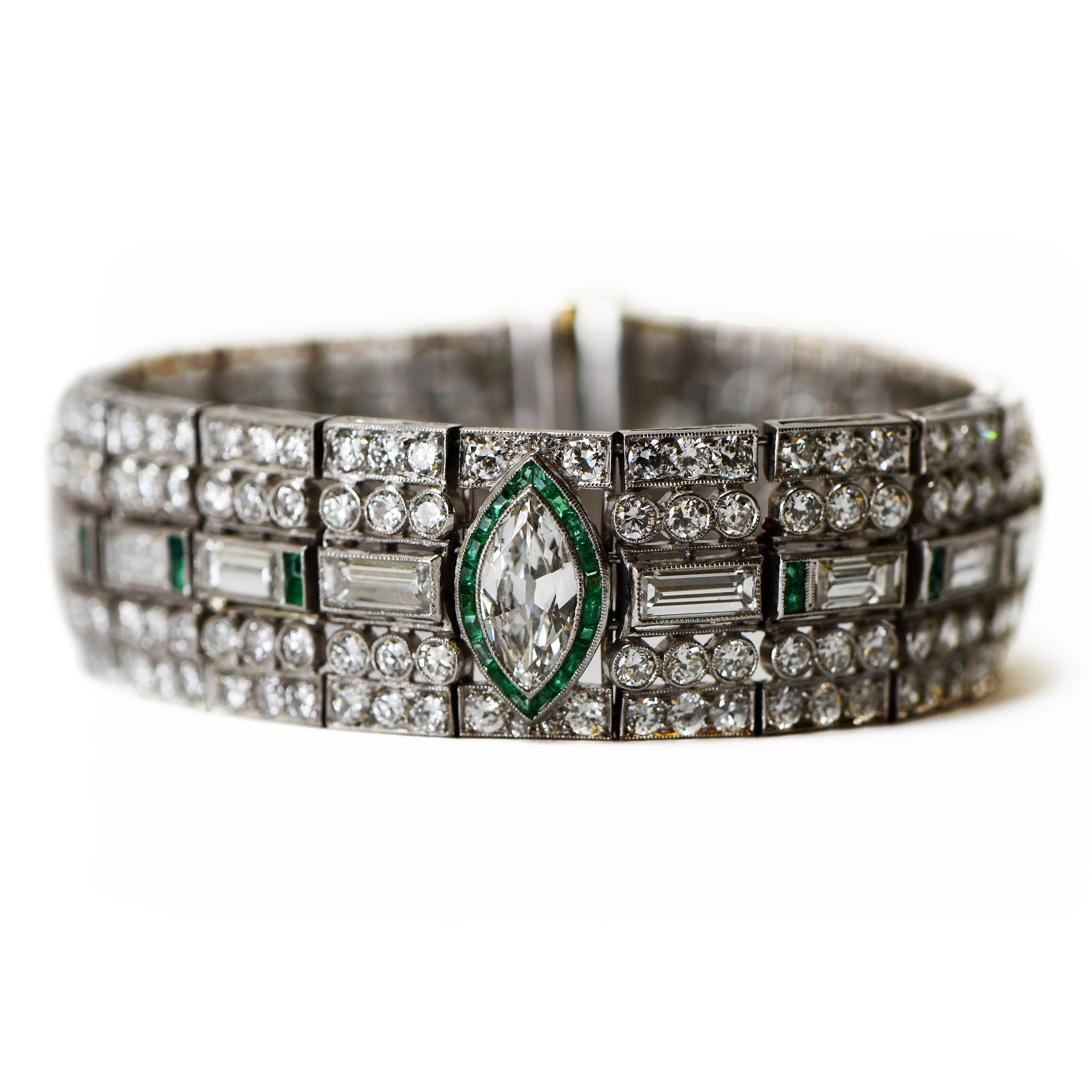 A captivating Art Deco-inspired bracelet featuring a symmetrical arrangement of brilliant-cut and baguette diamonds, accented with vibrant green emeralds. At its heart lies a marquise-cut diamond framed by calibré-cut emeralds, creating a striking focal point. This piece blends timeless elegance with meticulous craftsmanship—perfect for collectors and connoisseurs of fine jewelry.