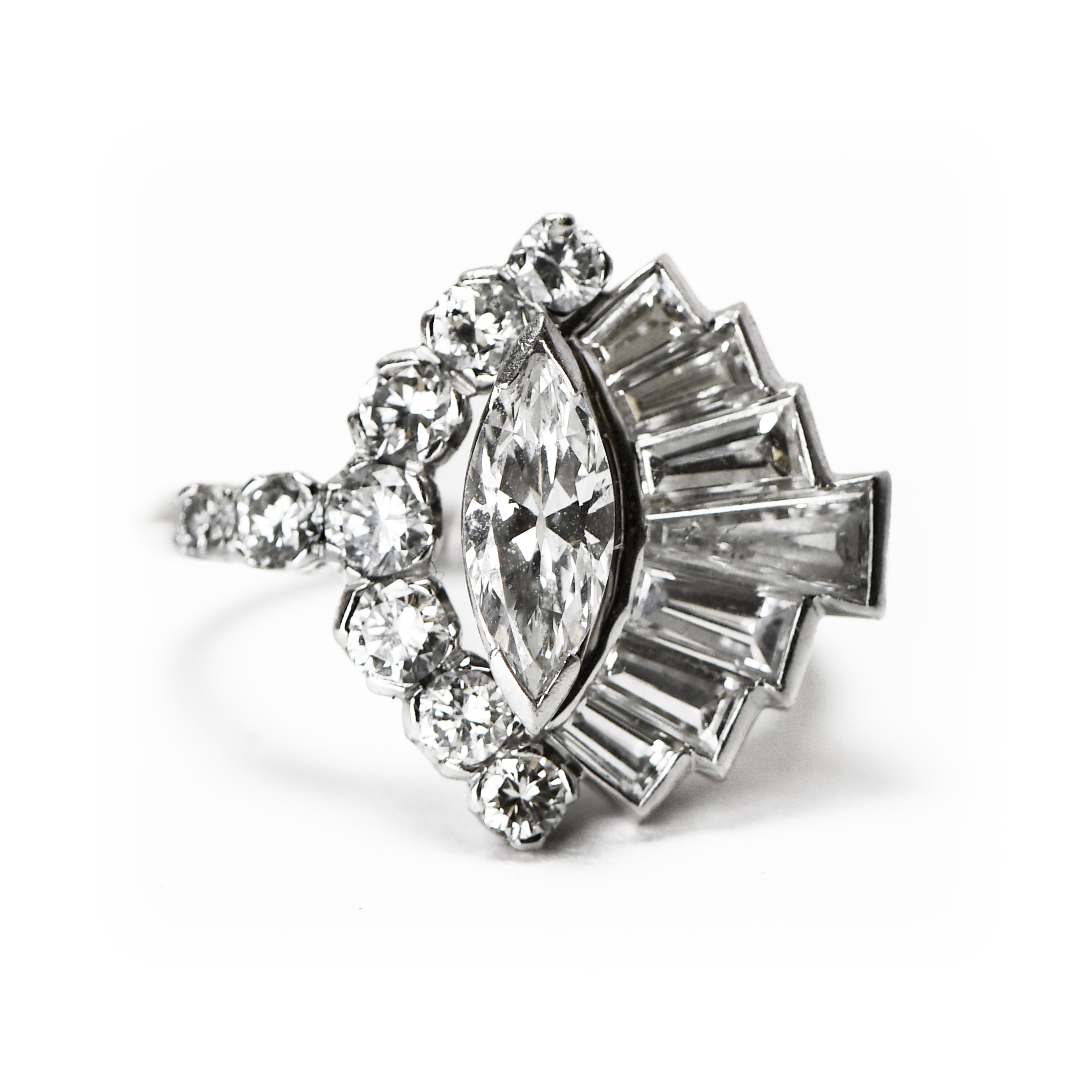 This elegant estate ring centers on a captivating marquise-cut diamond weighing approximately 0.90 carats, its elongated silhouette creating a graceful, flattering presence on the hand. Surrounding the center stone is a refined arrangement of nine round brilliant-cut diamonds totaling approximately 0.75 carats, adding soft scintillation and dimension to the design.