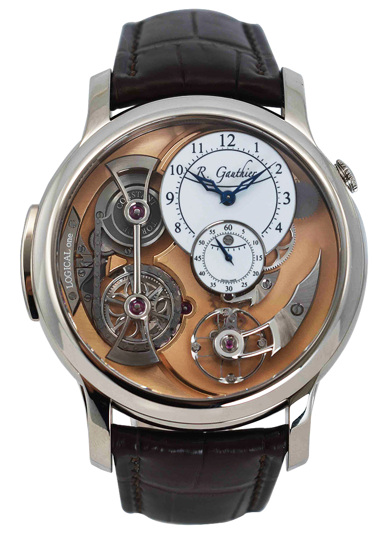 The Logical One not only reinvents constant force in its own way but also offers a totally innovative system of winding commanded by a pusher.