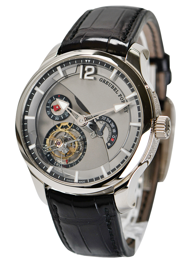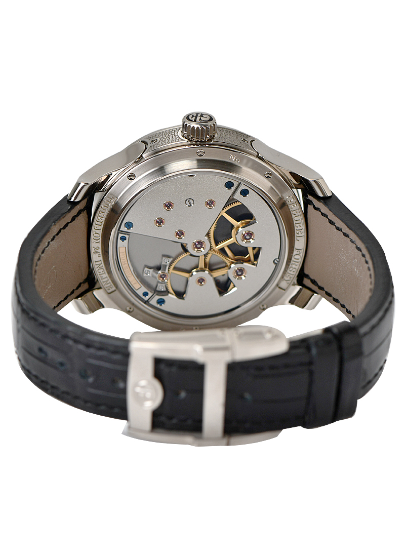 Greubel Forsey's primary intention was to present its third invention, the Tourbillon 24 Secondes, in a case that is as slender as possible and yet able to accommodate the unique inclined Tourbillon cage. It was the lateral projections of Greubel Forsey's asymmetric models that inspired this original solution. By incorporating a dome into the sapphire crystal on the back of the timepiece, they have created enough extra volume to allow the Tourbillon cage to overlap the reference surface of the movement bridges.