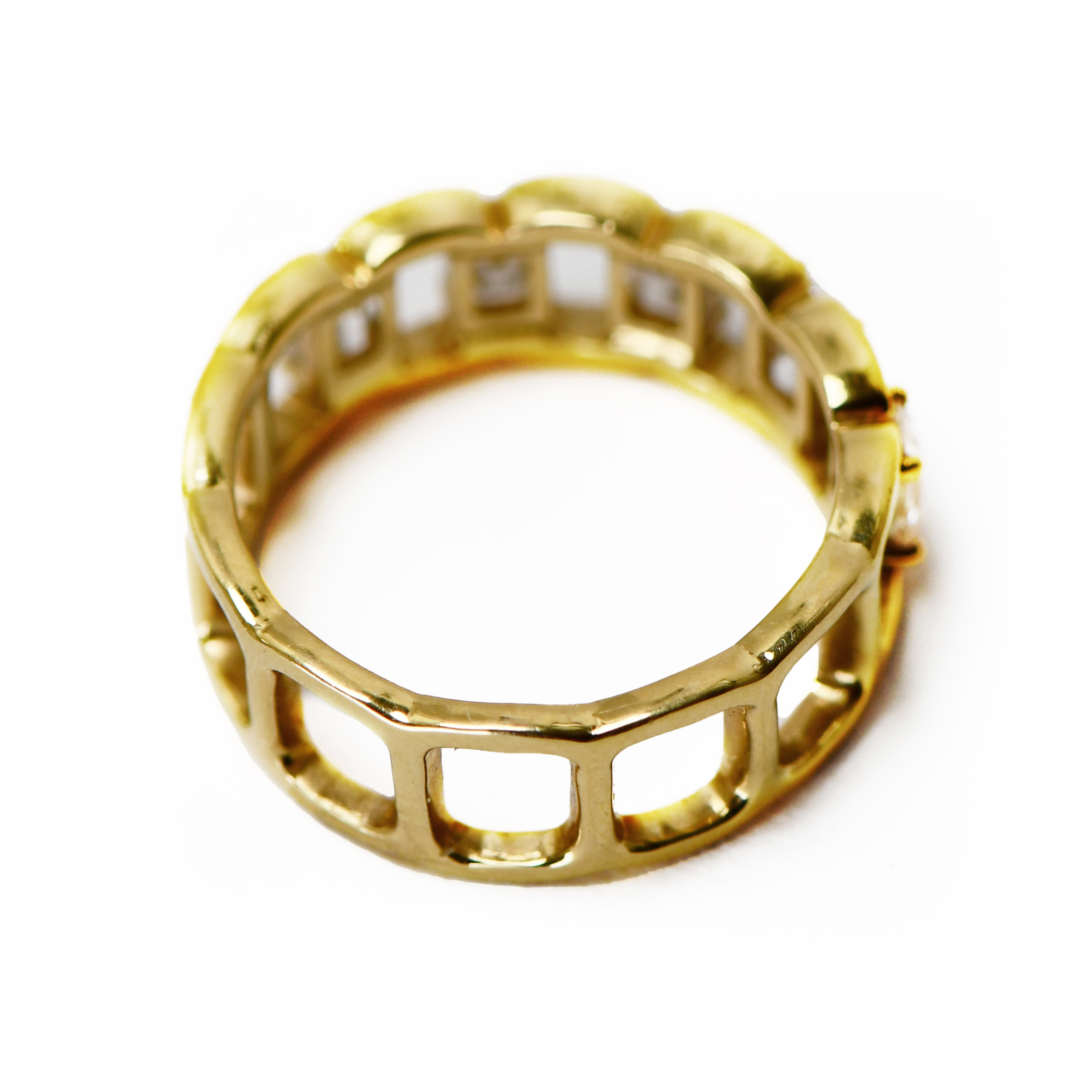 Crafted in 5.53 grams of luxurious 18k satin-finished yellow gold, this elegant band is adorned with 104 meticulously set pavé diamonds. Together, the diamonds total 0.74 carats, creating a continuous shimmer that beautifully contrasts with the soft matte glow of the satin gold.