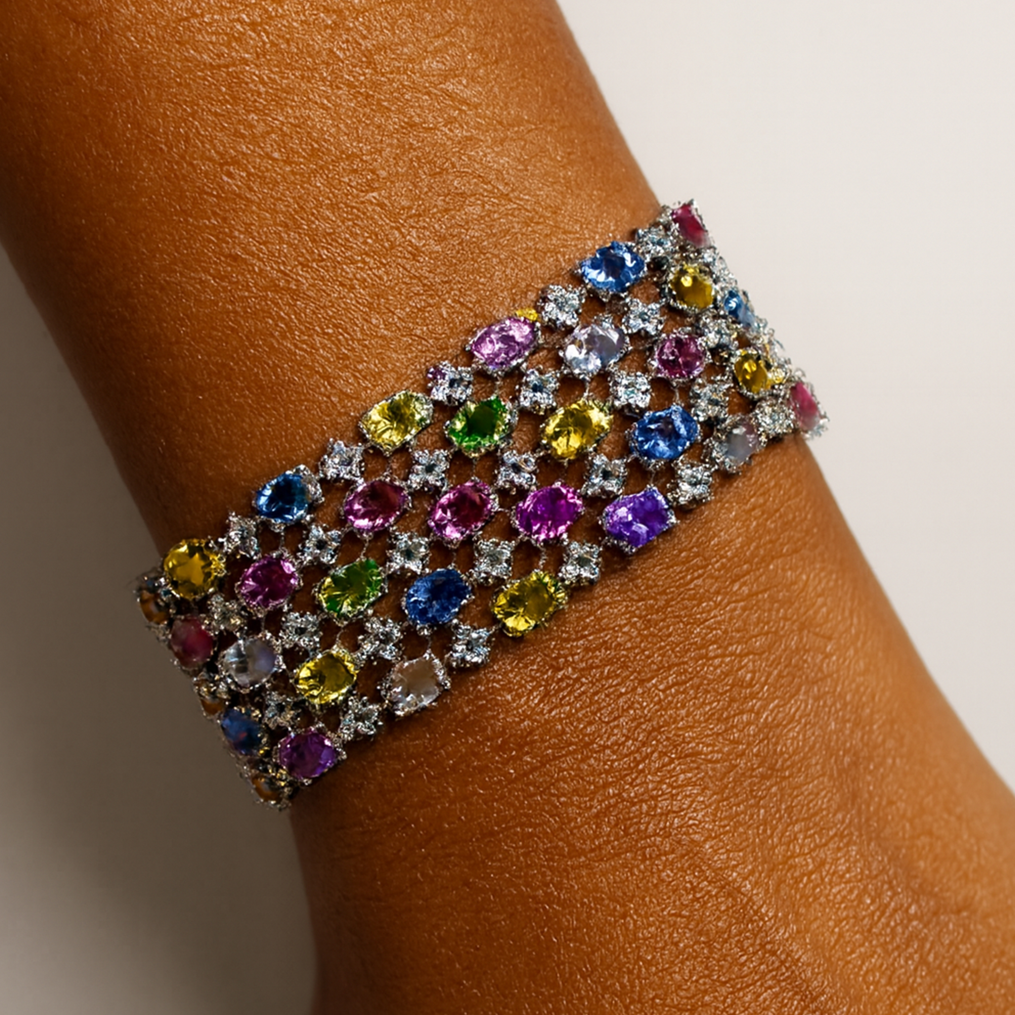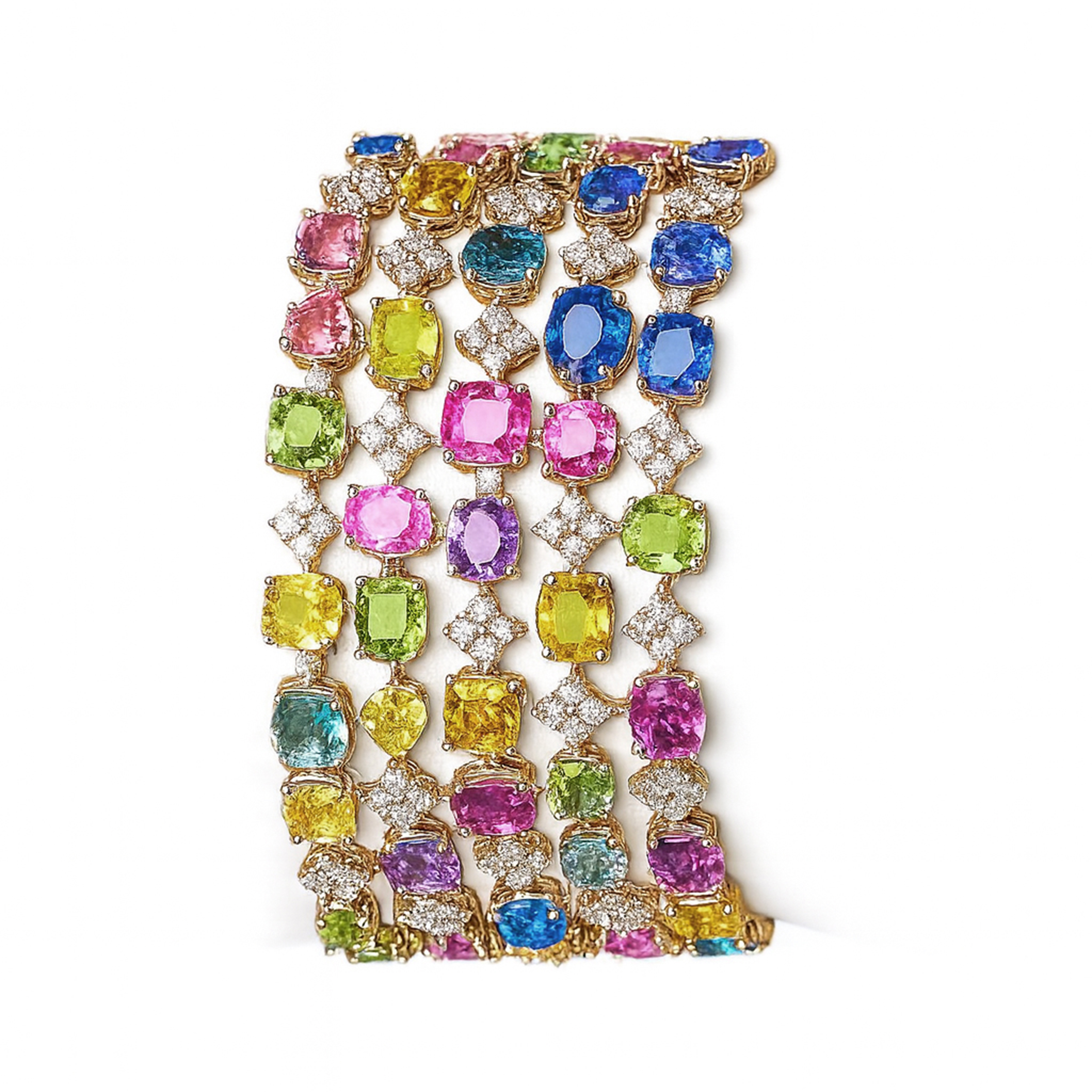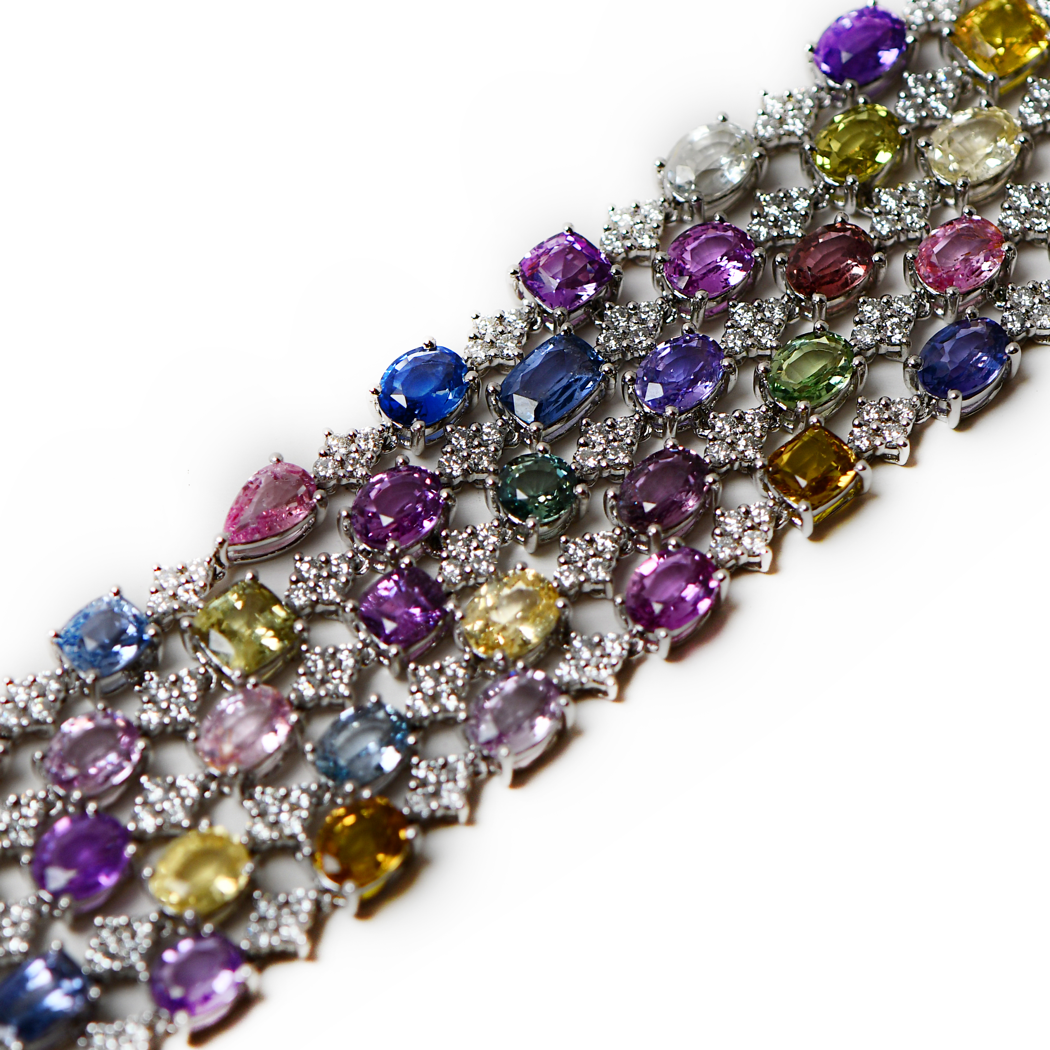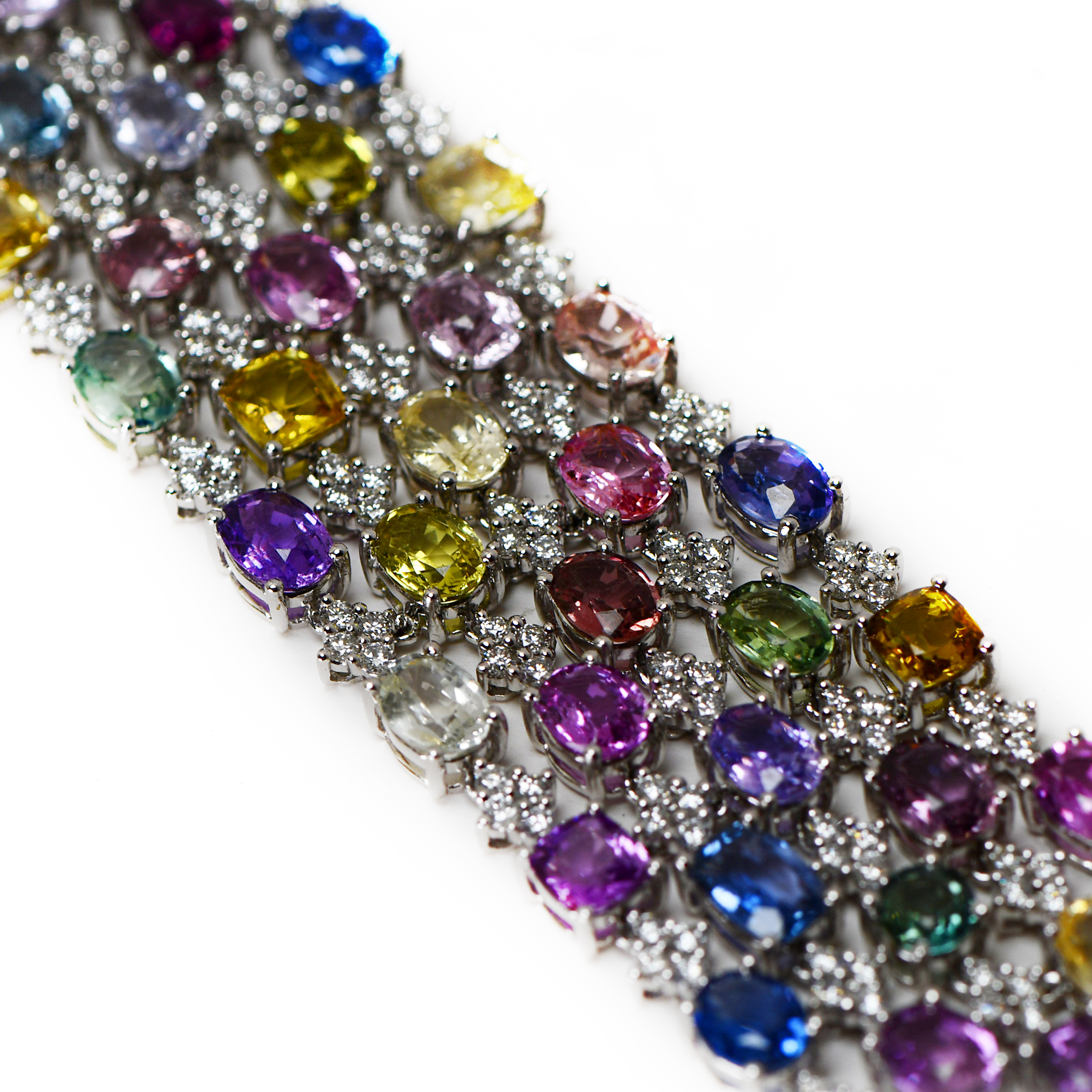 Radiating color and brilliance, this exquisite bracelet showcases 68.67 carats of natural colored sapphires, each hand-selected for its exceptional hue and clarity. Set in 18K white gold, the vibrant sapphires are beautifully complemented by approximately 208 fine white diamonds, totaling around 6.5 carats, adding a dazzling halo of light to every movement. A true statement of luxury and craftsmanship, this bracelet is a timeless celebration of color, sparkle, and sophistication.