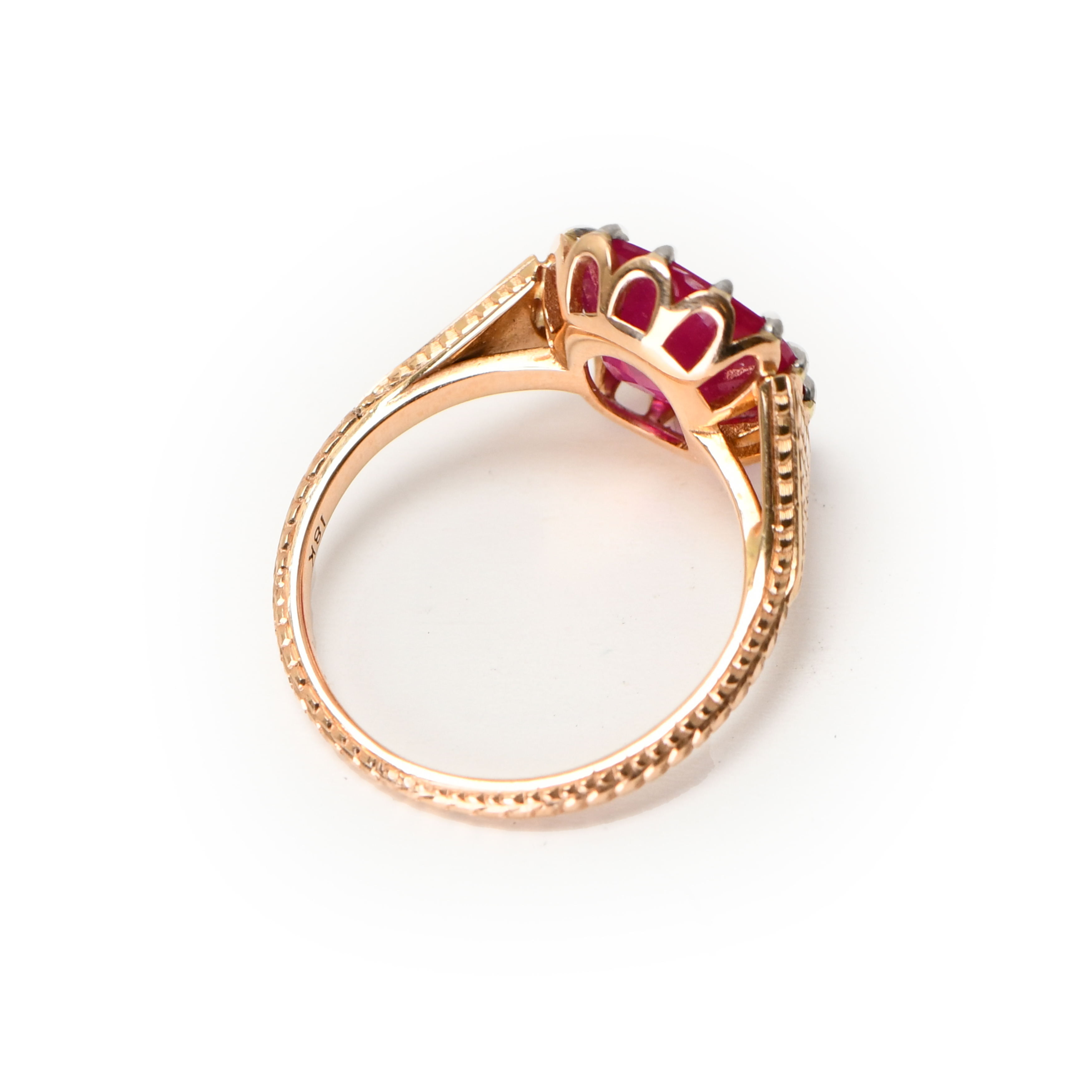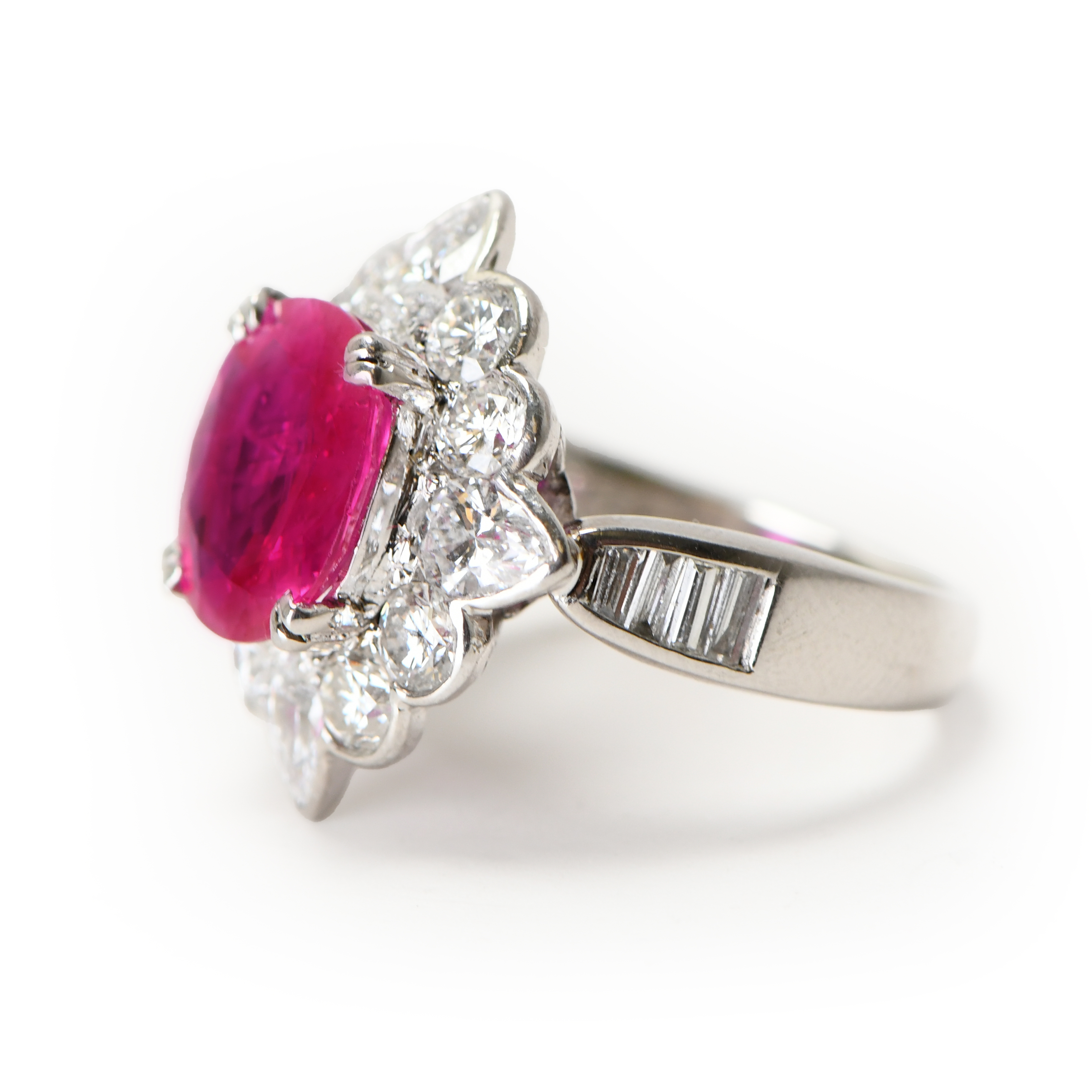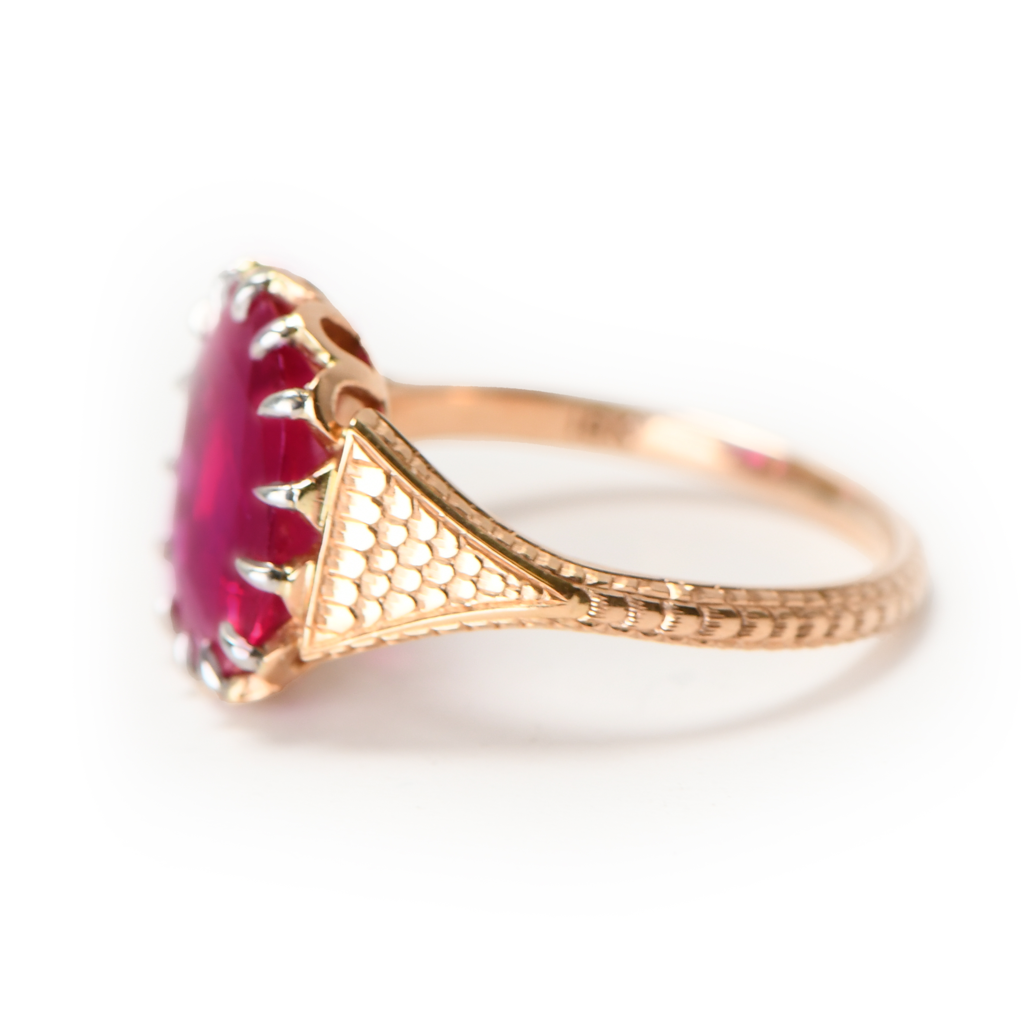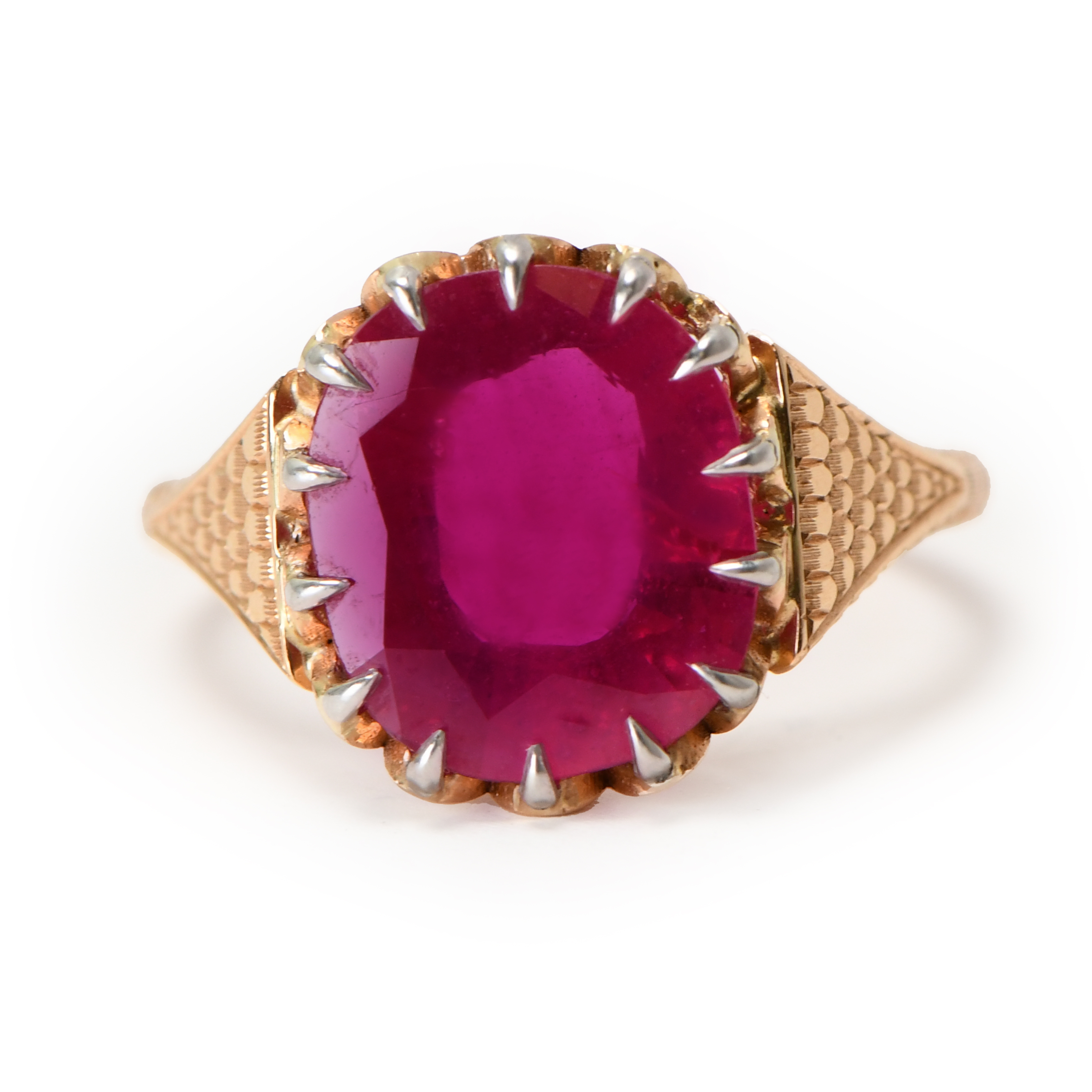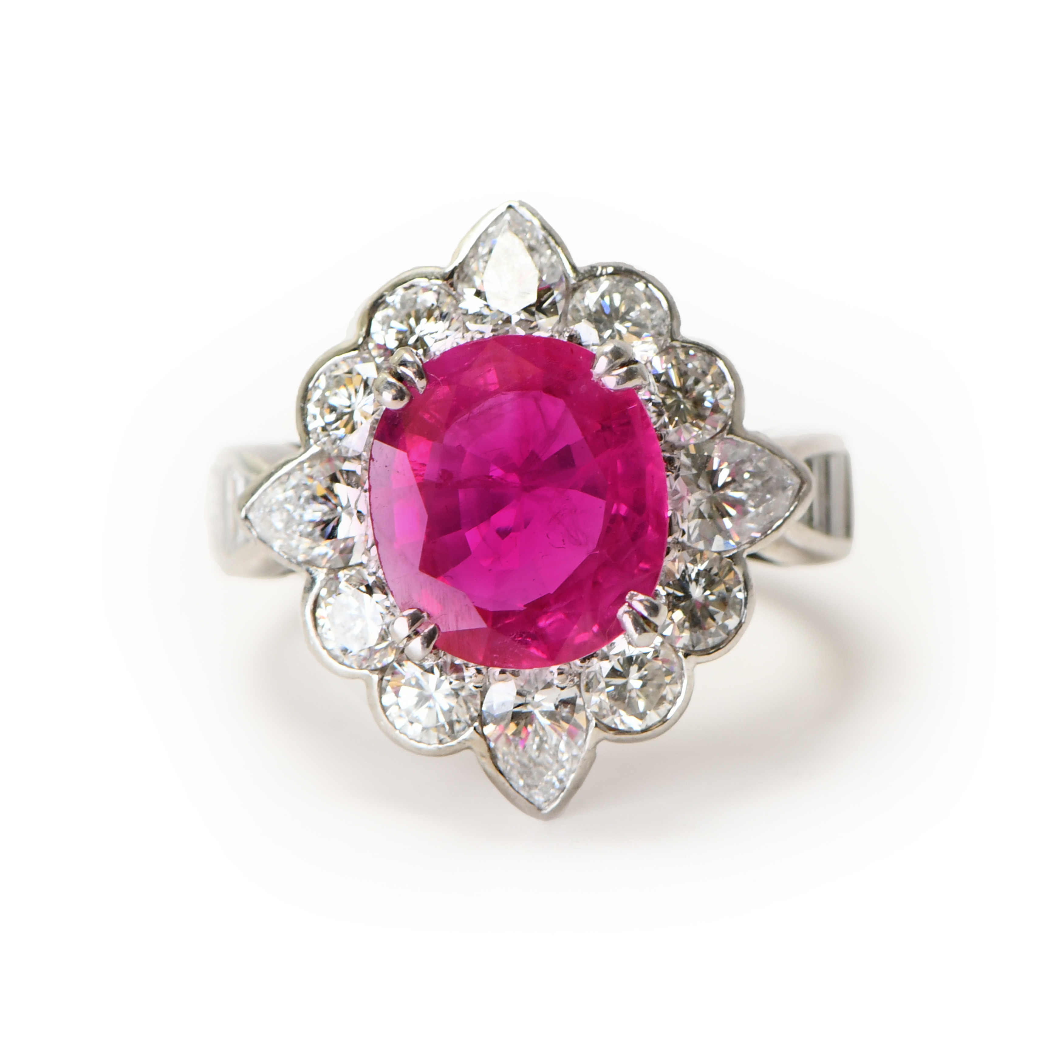 Set in a vintage-inspired 18kt rose gold setting, the cushion-cut ruby is complemented by a scallop hand-engraved pattern, adding a touch of timeless sophistication. This ring is not merely a piece of jewelry; it is a statement of exquisite taste and luxury, perfect for the discerning collector who appreciates the unparalleled beauty and historical significance of Burmese rubies.