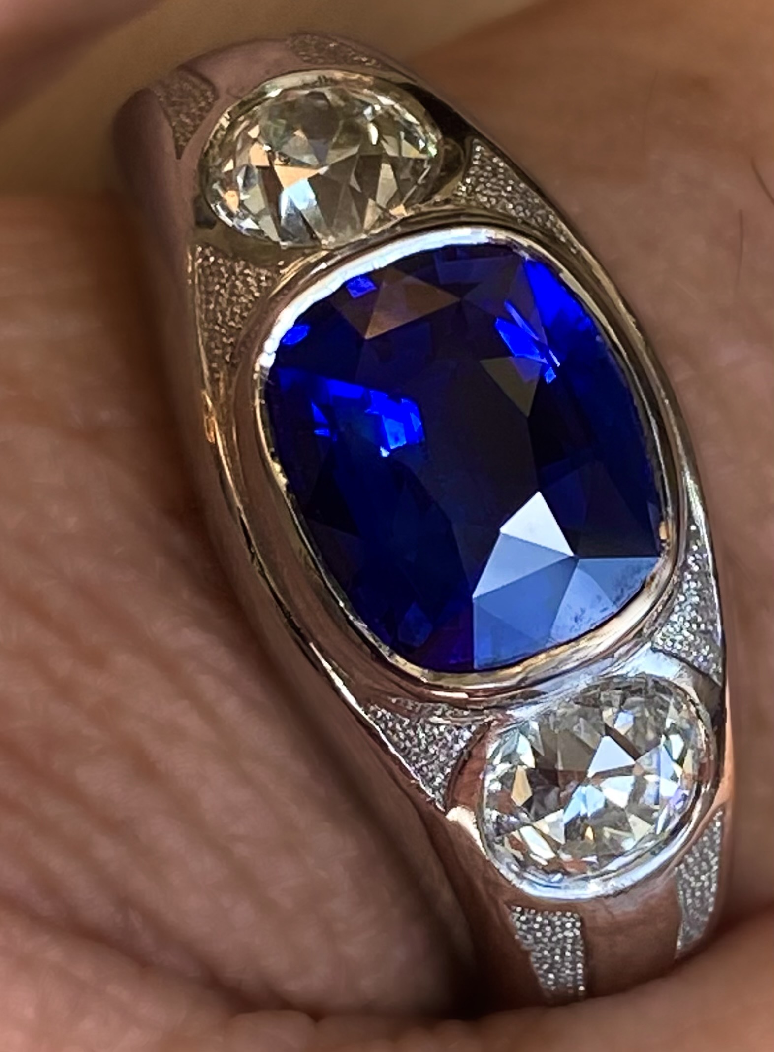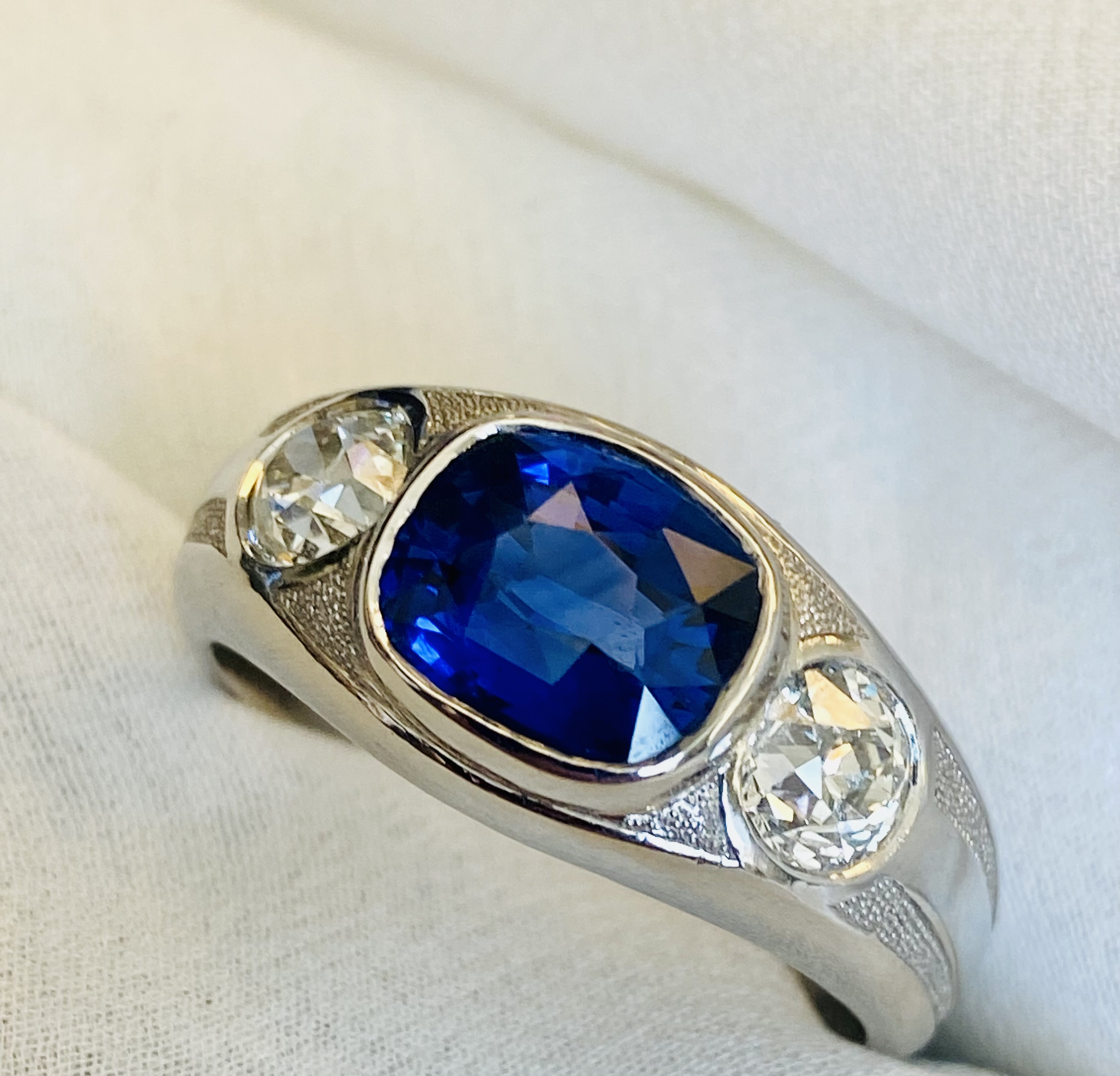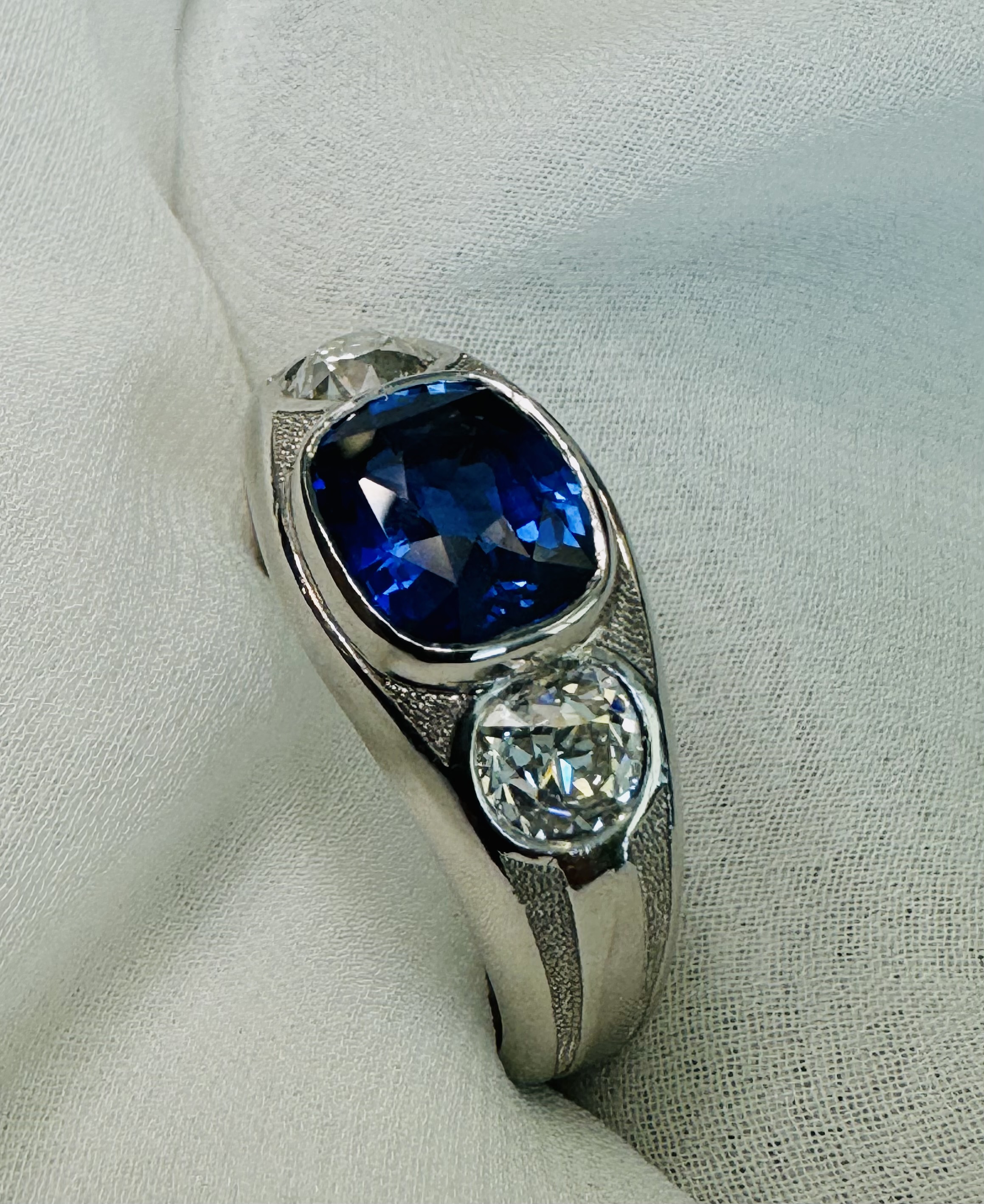 This exquisite Bulgari emerald-cut sapphire diamond ring features a breathtaking unheated 7-carat Madagascar sapphire, certified by AGL. Renowned for its stunning deep blue hue and exceptional clarity, the sapphire is elegantly set in a polished platinum band. The platinum provides a sleek and modern foundation, while brilliant diamond accents flank each side, enhancing the ring's overall beauty and brilliance. The emerald cut perfectly showcases the sapphire’s natural color and quality, creating a sophisticated silhouette. This luxurious piece is a true statement of elegance, ideal for special occasions or as a cherished addition to any fine jewelry collection.