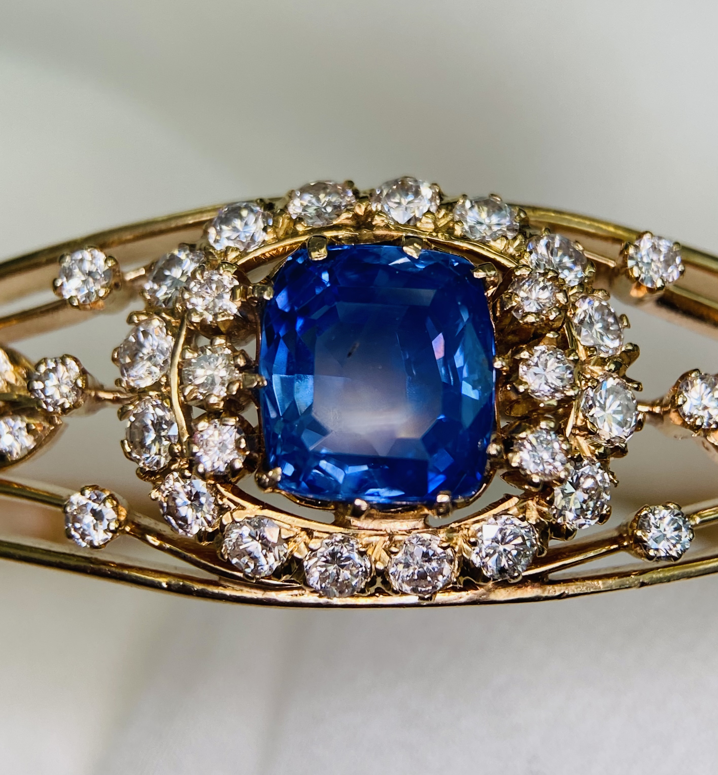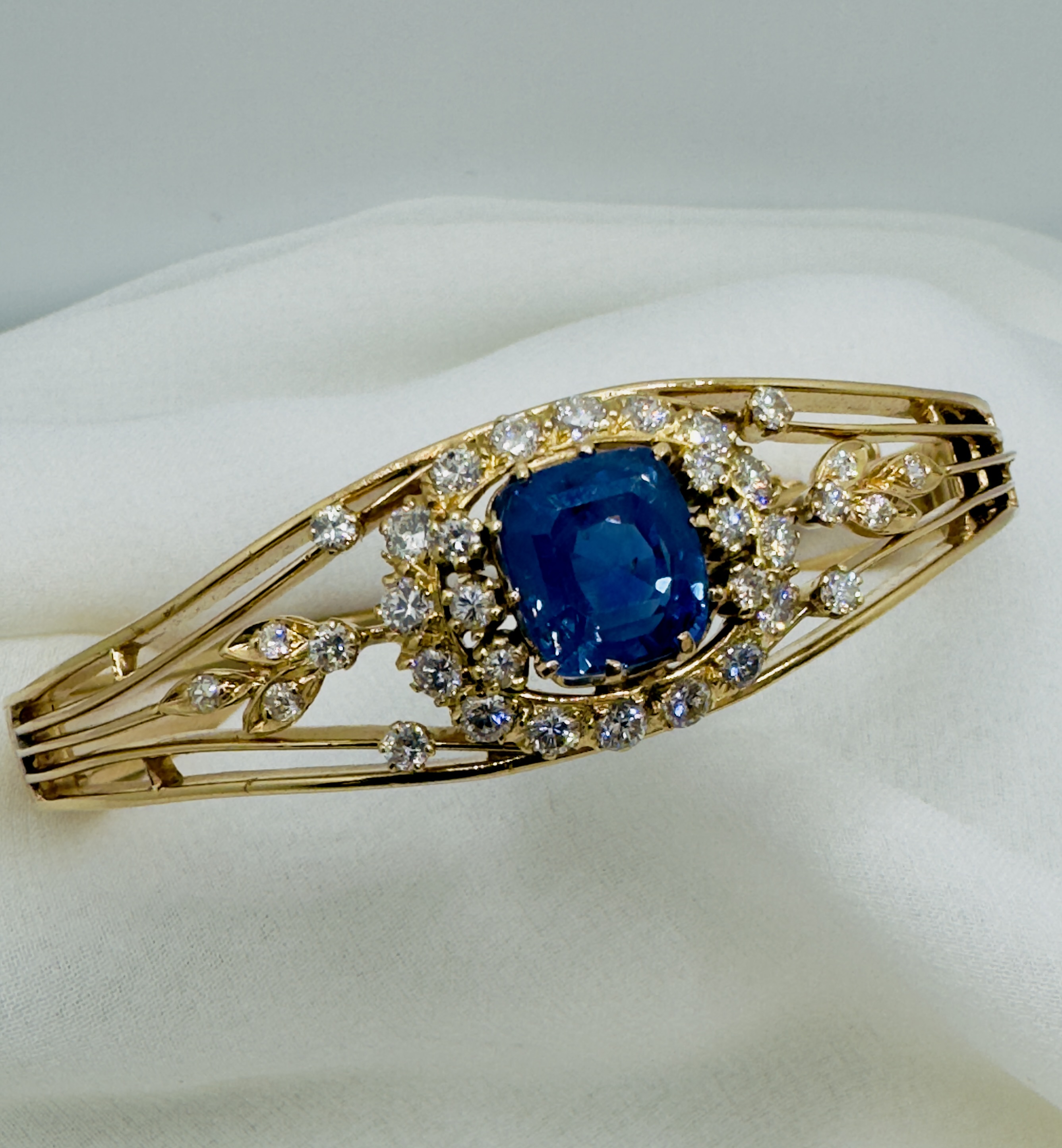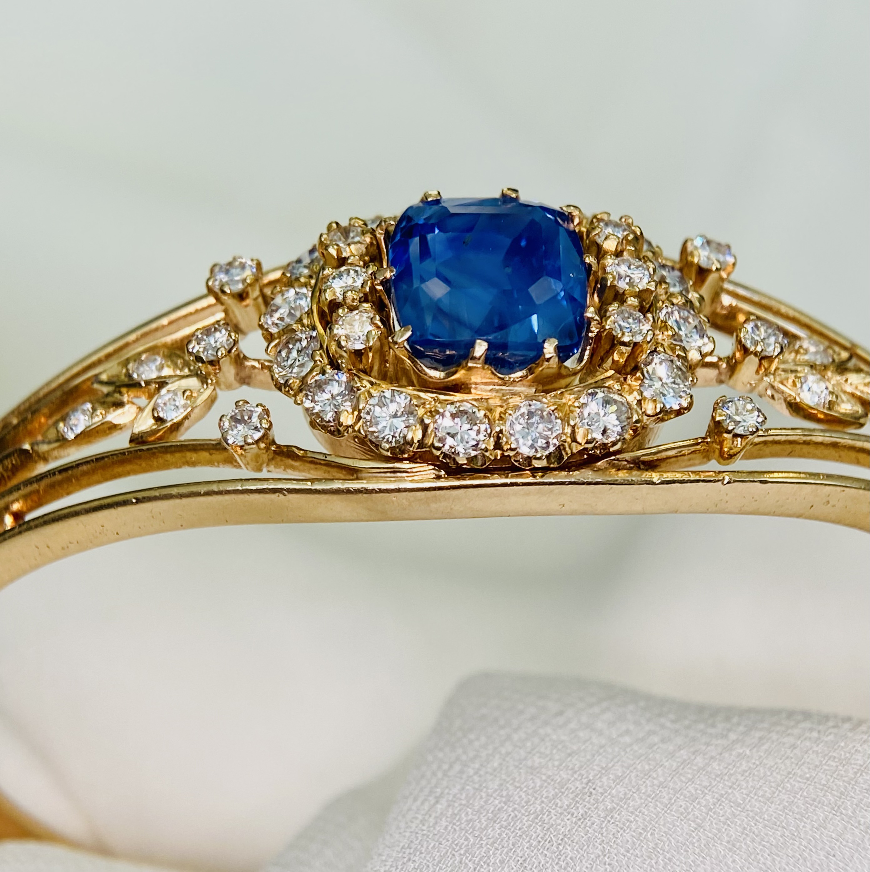 The sapphire is embraced by halos of scintillating diamonds, their brilliance enhancing the central stone’s pristine beauty and echoing the light filtering through a garden’s foliage. This bangle combines the artful intricacies of its era with a whisper of nature, featuring filigree patterns and openwork that reveal a heart captivated by the organic forms of the natural world.