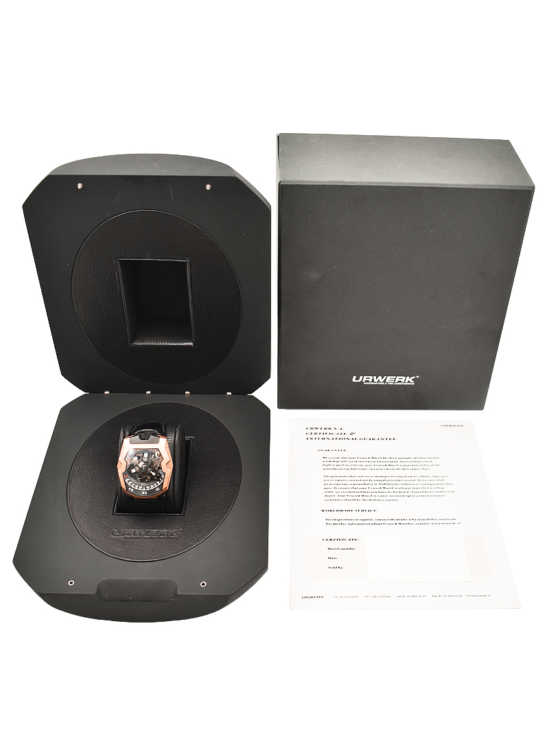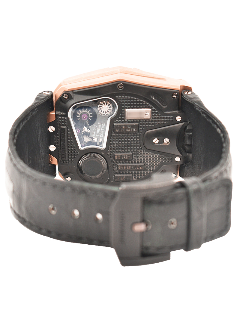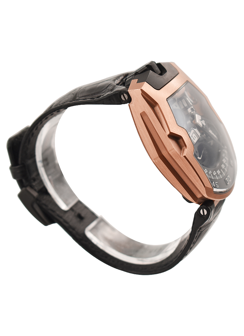 The UR-210’s satellite complication with retrograde minute features a world-first indication – a winding efficiency pointer that indicates winding efficiency over the last two hours.